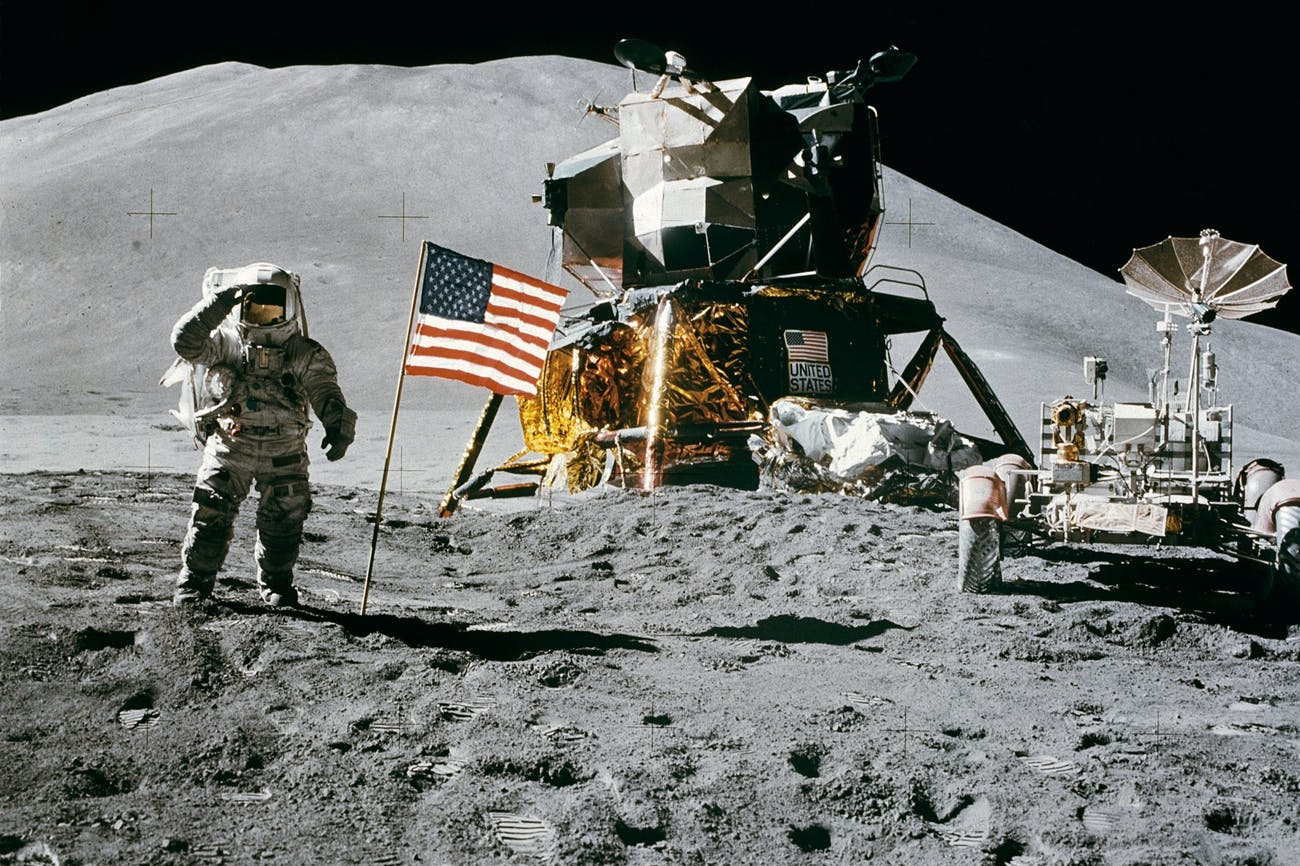Apollo kapsülü servis modülüyle birlikte Ayın etrafında yörüngede görülüyor NASA, Public domain, via Wikimedia Commons